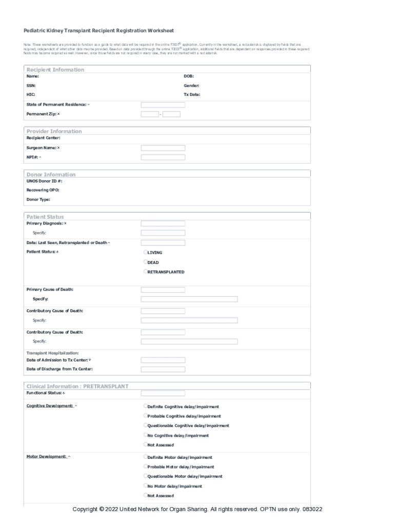 Pediatric Kidney Transplant Recipient Registration Worksheet Note: These worksheets are provided to function as a guide to what data will be required in the online TIED application. Currently, in