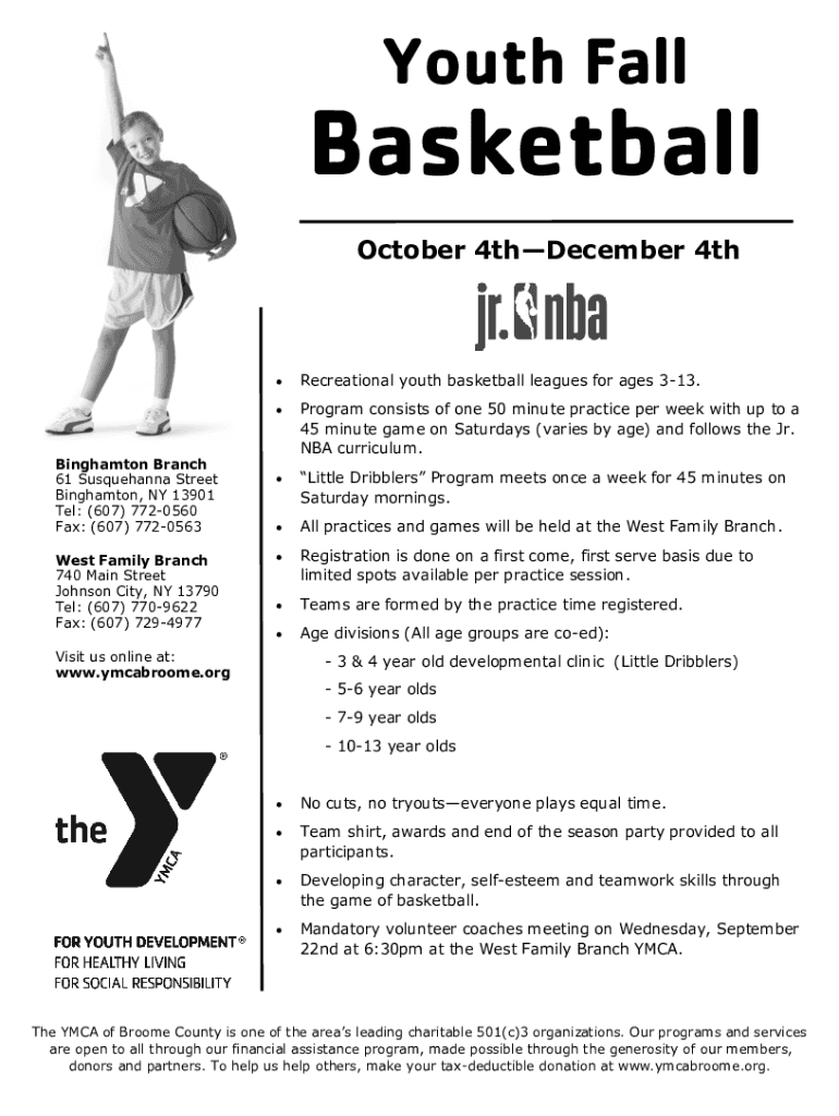 Youth FallBasketball October 4thDecember 4thBinghamton Branch 61 Susquehanna Street Binghamton, NY 13901 Tel: (607) 7720560 Fax: (607) 7720563 West Family Branch 740 Main Street Johnson City, NY 13790