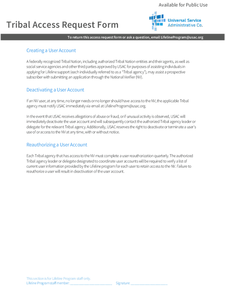 Available for Public Serial Access Request Form To return this access request form or ask a question, email LifelineProgram@usac.orgCreating a User Account A federally recognized Tribal Nation, including
