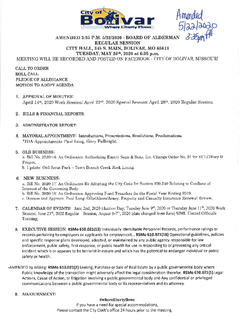 Get the free 2020.05.26 Regular Session Packet with Amended Agenda - bolivar mo