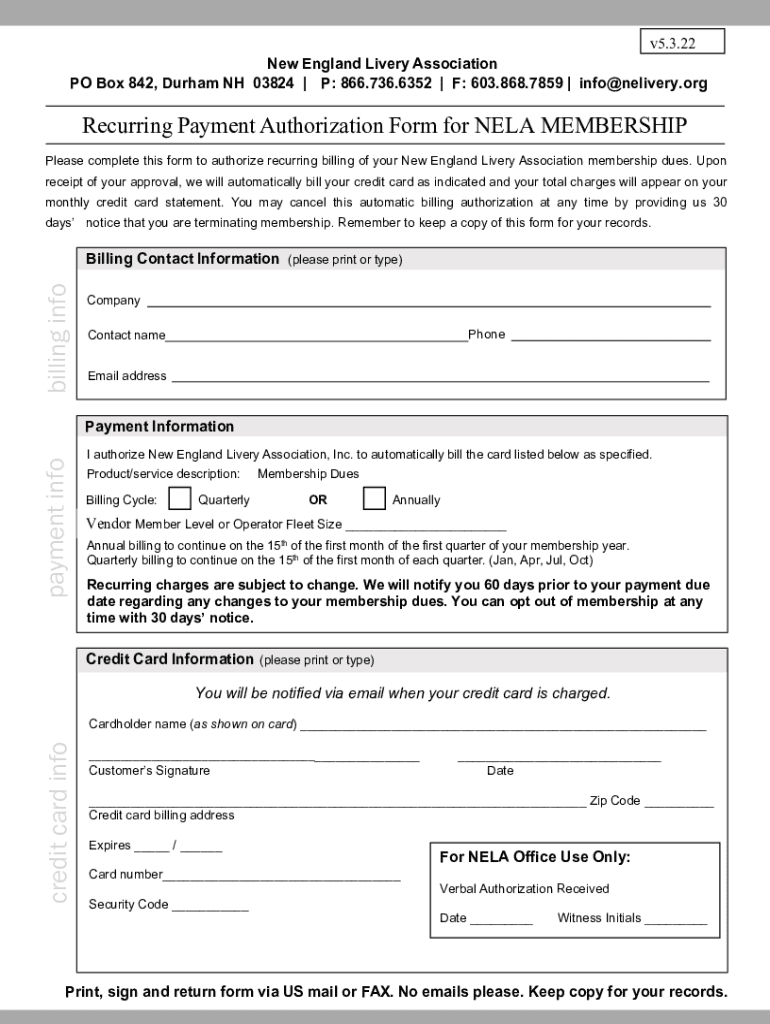 V5.3.22New England Livery Association PO Box 842, Durham NH 03824 | P: 866.736.6352 | F: 603.868.7859 | info@nelivery.orgRecurring Payment Authorization Form for NEA MEMBERSHIP Please complete this
