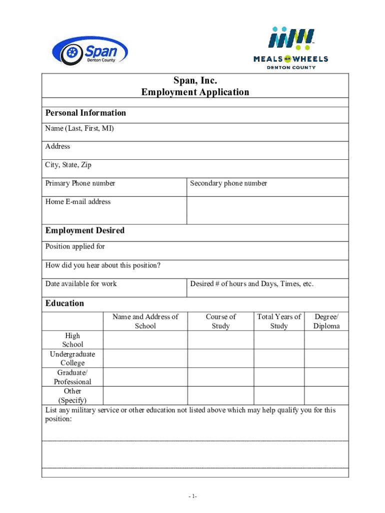 Span, Inc. Employment Application Personal Information Name (Last, First, MI) Address City, State, Zip Primary Phone numberSecondary phone cumbersome Email addressEmployment Desired Position applied