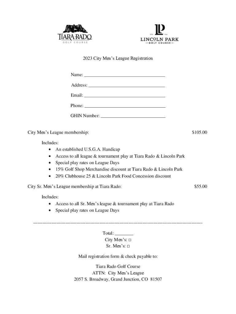 2023 City Men League RegistrationName: ___ Address: ___ Email: ___ Phone: ___ GAIN Number: ___ City Men League membership:$105.00Includes: An established U.S.G.A. Handicap Access to all league & tournament