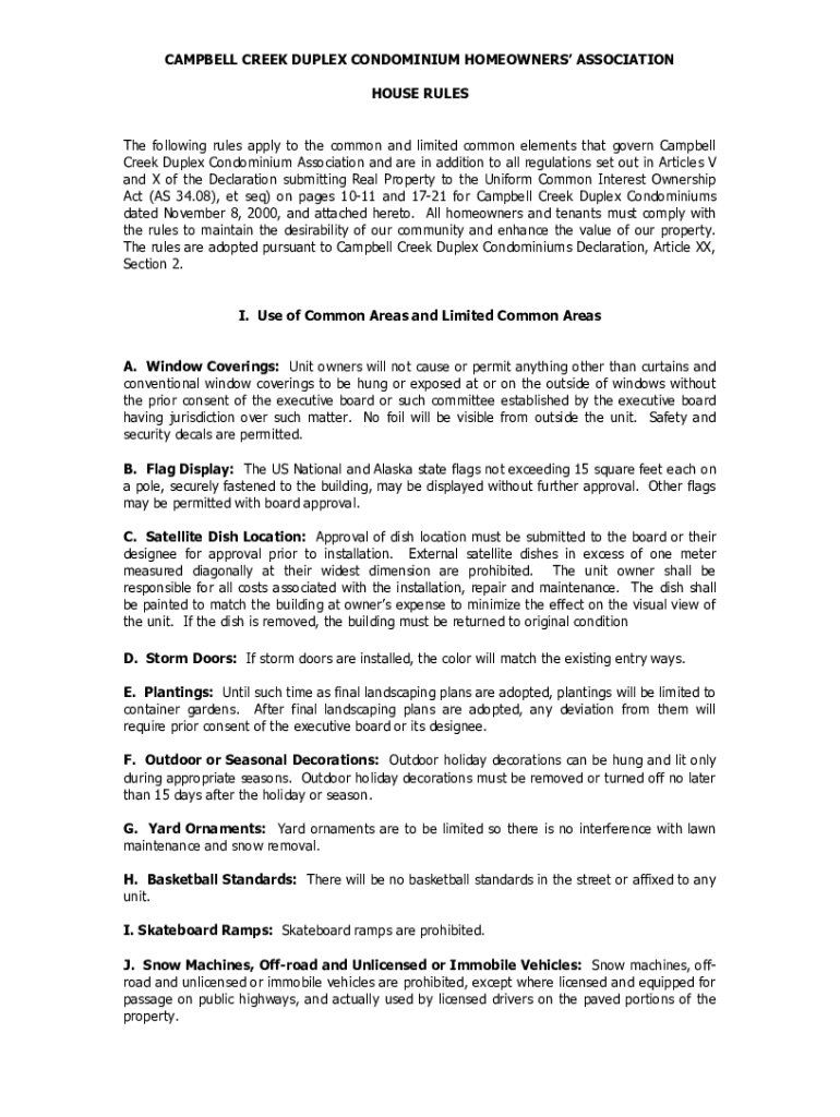 CAMPBELL CREEK DUPLEX CONDOMINIUM HOMEOWNERS ASSOCIATION HOUSE RULES The following rules apply to the common and limited common elements that govern Campbell Creek Duplex Condominium Association and