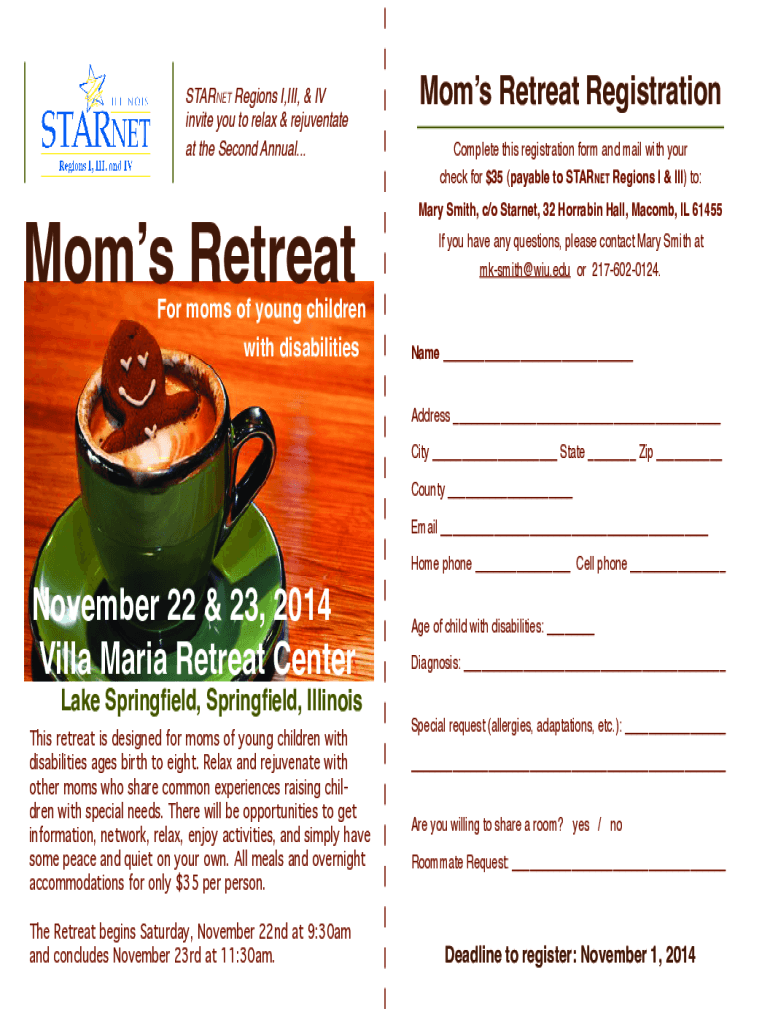 Starlet Regions I, III, & IV invite you to relax & rejuvenate at the Second Annual... Moms Retreat moms of young children with disabilitiesMoms Retreat Registration Complete this registration form