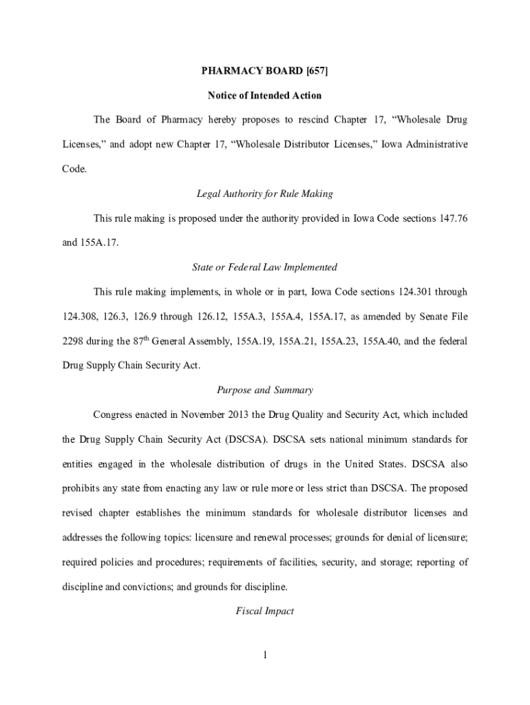 PHARMACY BOARD [657] Notice of Intended Action The Board of Pharmacy hereby proposes to rescind Chapter 17, Wholesale Drug Licenses, and adopt new Chapter 17, Wholesale Distributor Licenses, Iowa
