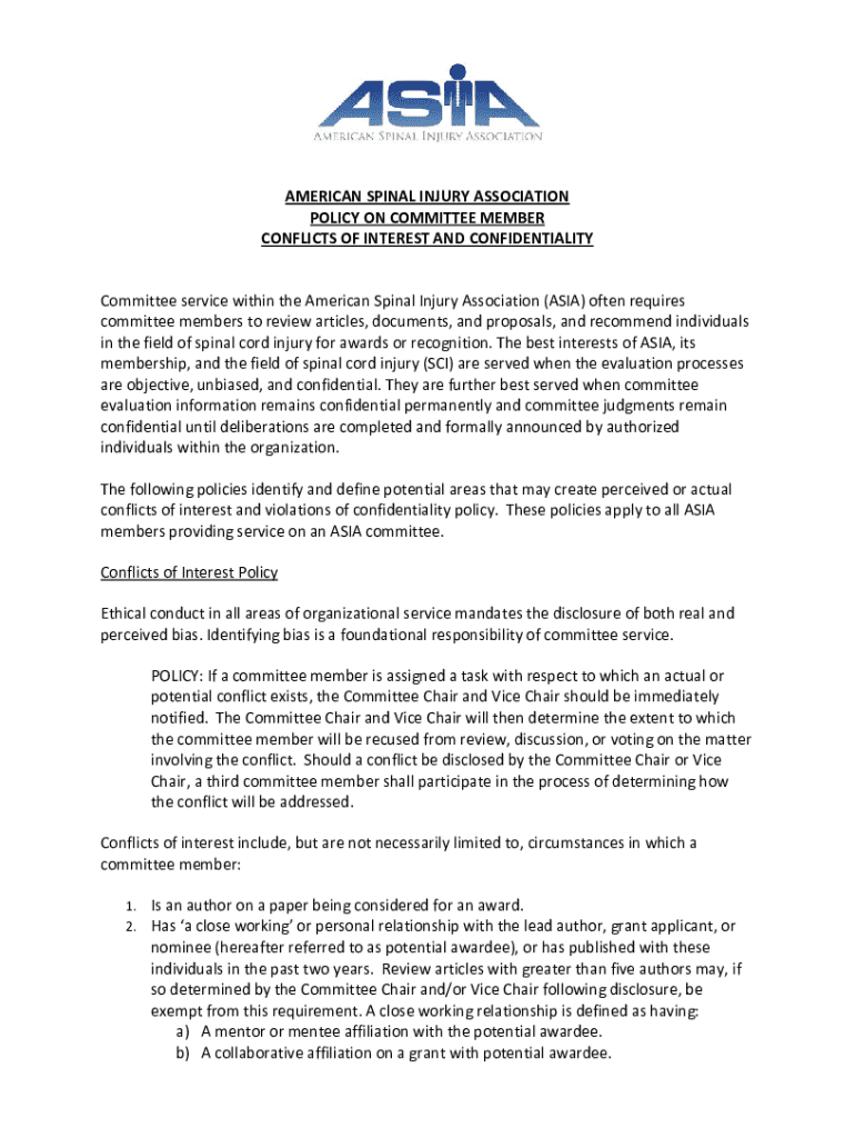 AMERICAN SPINAL INJURY ASSOCIATION POLICY ON COMMITTEE MEMBER CONFLICTS OF INTEREST AND CONFIDENTIALITY Committee service within the American Spinal Injury Association (ASIA) often requires committee
