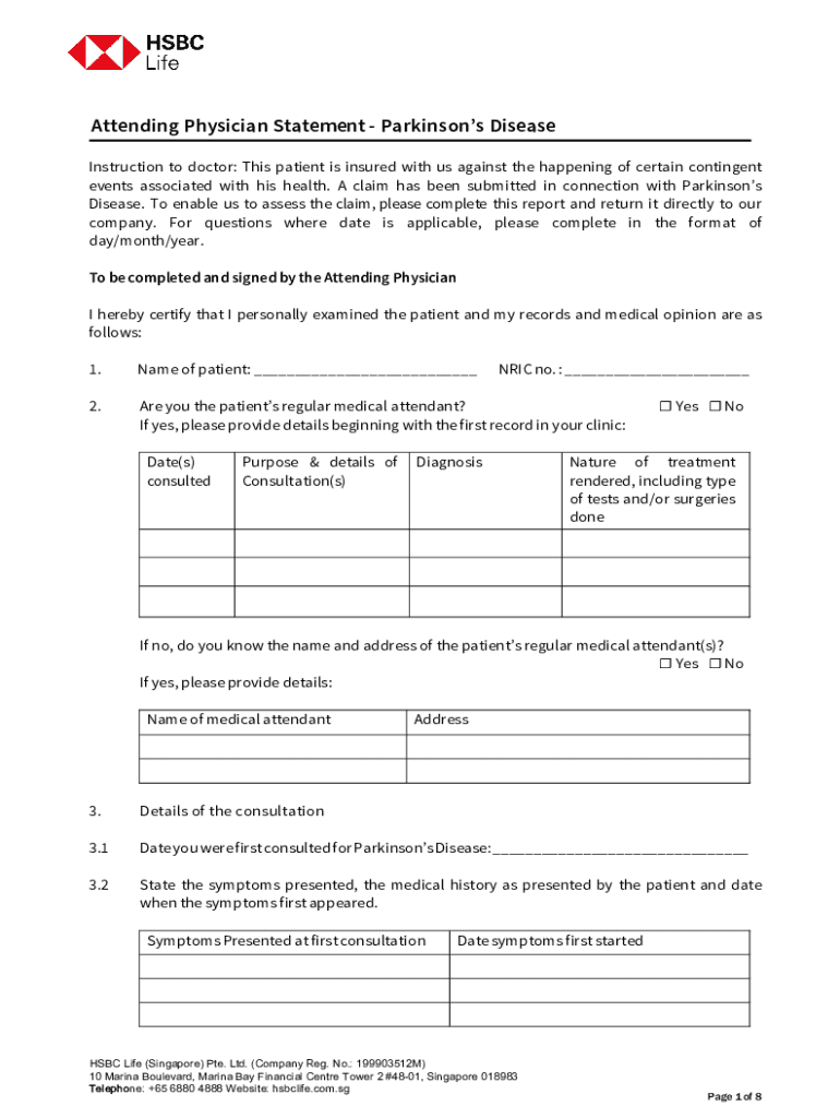 Attending Physician Statement Parkinson's Disease Instruction to doctor: This patient is insured with us against the happening of certain contingent events associated with his health. A claim has