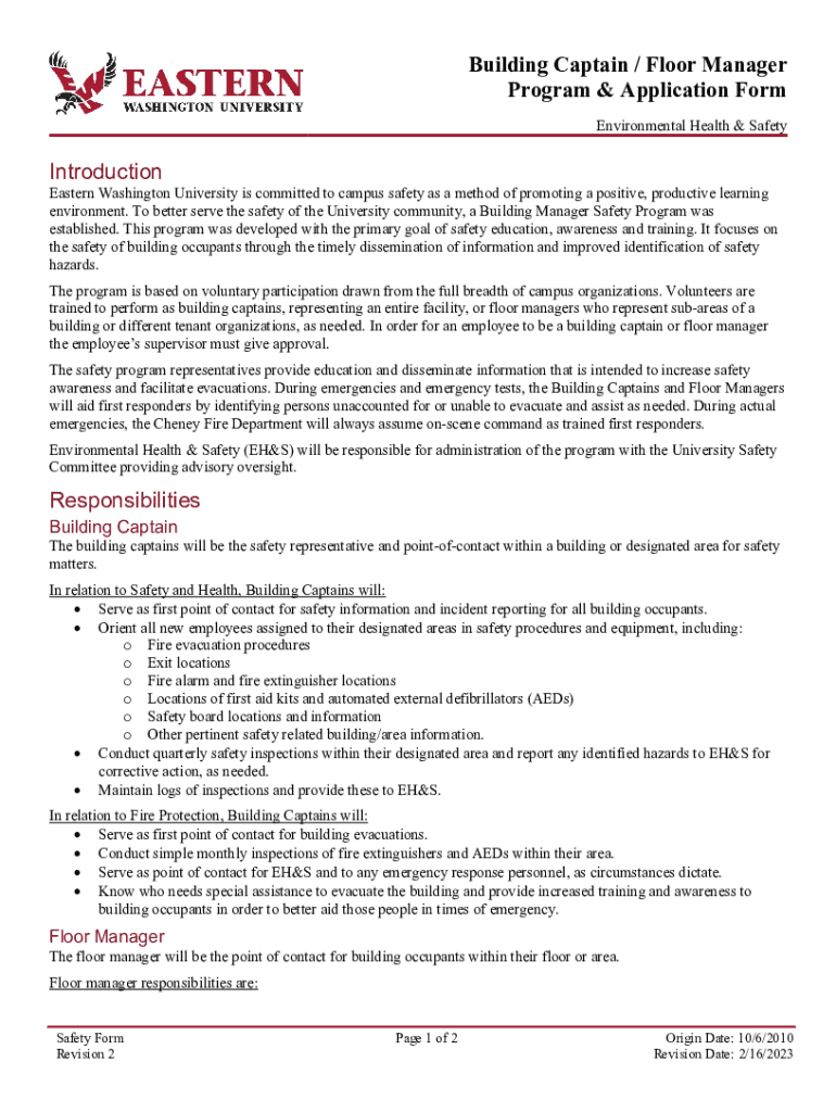 Building Captain / Floor Manager Program & Application Form Environmental Health & SafetyIntroduction Eastern Washington University is committed to campus safety as a method of promoting a positive,