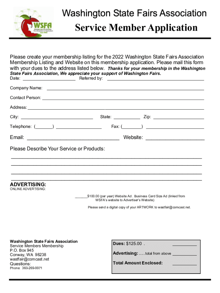 Service Member Application Please create your membership listing for the 2022 Washington State Fairs Association Membership Listing and Website on this membership application. Please mail this form