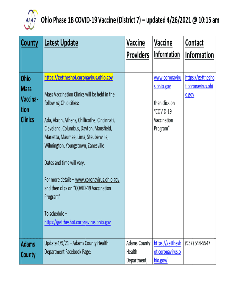 Prophase O e1BCOVIID19Vacccine(Distrrict7) up pdated4//26/2021@ @10:15a AMC County LatestUpdateO Ohio M Mass V Vaccine station C Clinicshttps://getttheshot.corn virus.Ohio.gov Massacring nationClinicsw
