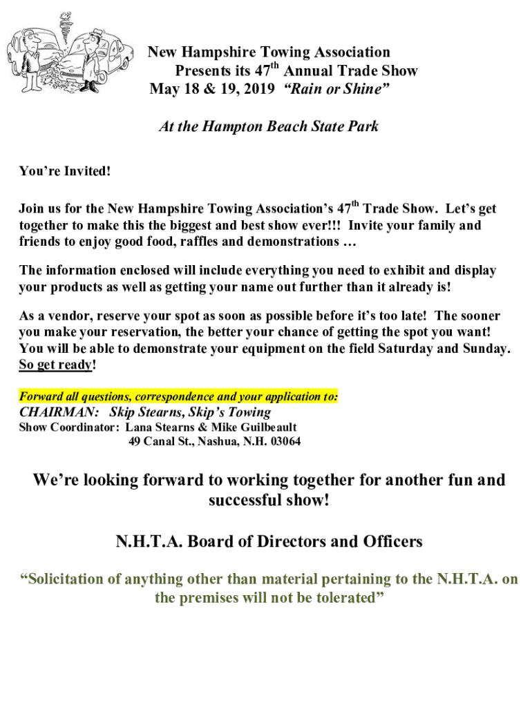 New Hampshire Towing Association Presents its 47th Annual Trade Show May 18 & 19, 2019 Rain or Shine At the Hampton Beach State Park You're Invited! Join us for the New Hampshire Towing Associations