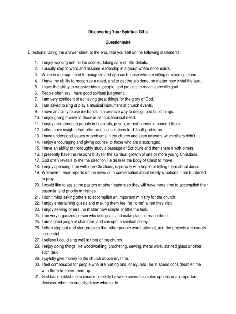 Discovering Your Spiritual Gifts Questionnaire Directions: Using the answer sheet at the end, rate yourself on the following statements. 1. 2. 3. 4. 5. 6. 7. 8. 9. 10. 11. 12. 13. 14. 15. 16. 17.