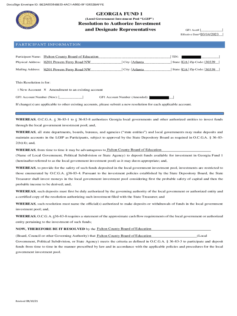 DocuSign Envelope ID: BE2A6038BB334AC1A86D9F1D632BAFFEGEORGIA FUND 1 (Local Government Investment Pool LIP)Resolution to Authorize Investment and Designate RepresentativesGF1 Acct# |___| Effective