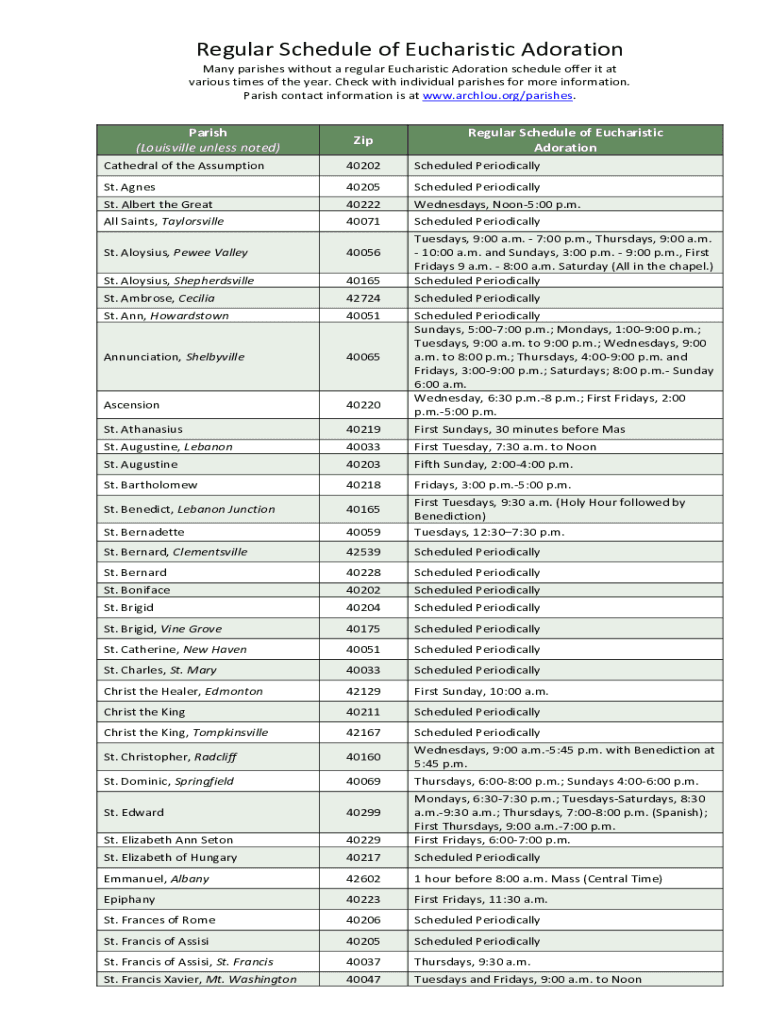 Regular Schedule of Eucharistic Adoration Many parishes without a regular Eucharistic Adoration schedule offer it at various times of the year. Check with individual parishes for more information.