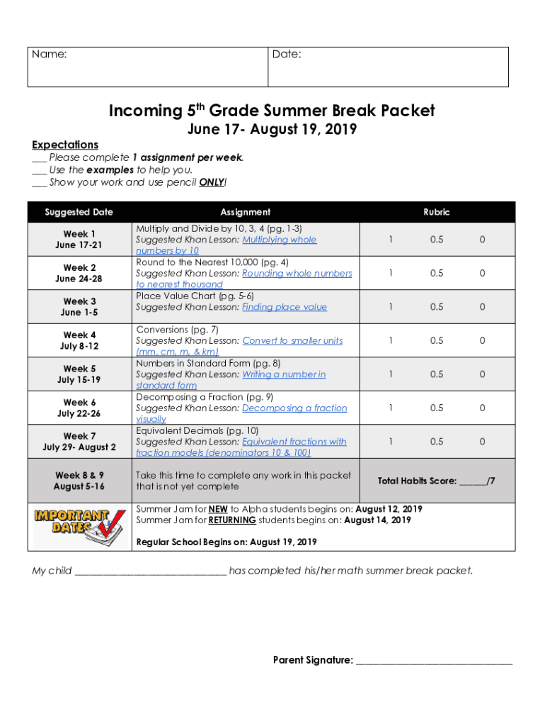 Name: Date:Incoming 5th Grade Summer Break Packet Expectations June 17 August 19, 2019___ Please complete 1 assignment per week. ___ Use the examples to help you. ___ Show your work and use pencil