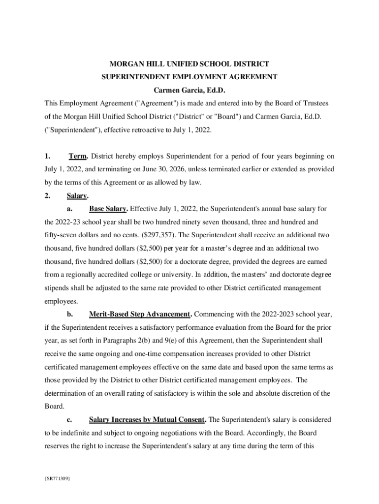 MORGAN HILL UNIFIED SCHOOL DISTRICT SUPERINTENDENT EMPLOYMENT AGREEMENT Carmen Garcia, Ed. D. This Employment Agreement (\” Agreement\”) is made and entered into by the Board of Trustees of the