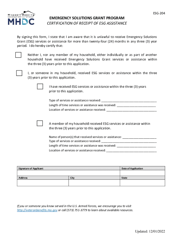 ESG204EMERGENCY SOLUTIONS GRANT PROGRAM CERTIFICATION OF RECEIPT OF ESG ASSISTANCE By signing this form, I state that I am aware that it is unlawful to receive Emergency Solutions Grant (ESG) services