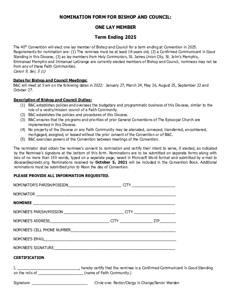 Get the free NOMINATION FORM FOR BISHOP AND COUNCIL