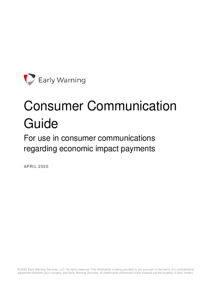 Consumer Communication Guide For use in consumer communications regarding economic impact payments APRIL 2020 2020 Early Warning Services, LLC. All rights reserved. This information is being provided