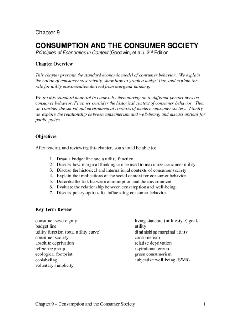 Chapter 9CONSUMPTION AND THE CONSUMER SOCIETY Principles of Economics in Context (Goodwin, et al.), 2nd Edition Chapter Overview This chapter presents the standard economic model of consumer behavior.