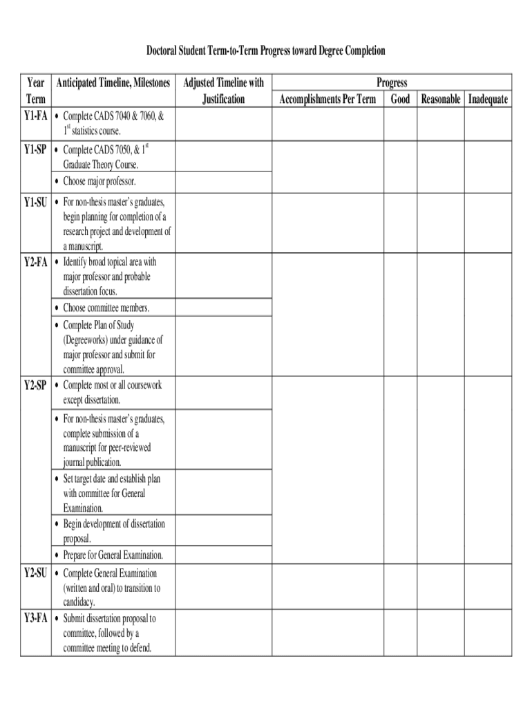 Doctoral Student TermtoTerm Progress toward Degree Completion Year Anticipated Timeline, Milestones Term Y1FA Complete CADS 7040 & 7060, & 1st statistics course. Y1SP Complete CADS 7050, & 1st Graduate