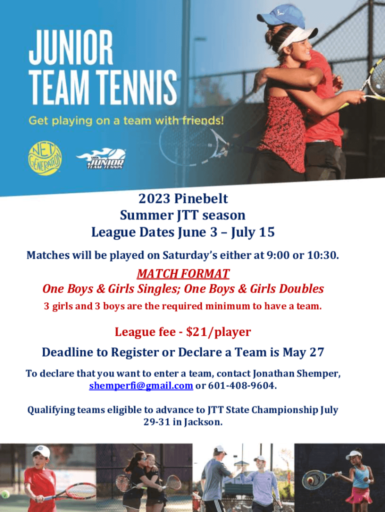 2023 Pine belt Summer JET season League Dates June 3 July 15 Matches will be played on Saturdays either at 9:00 or 10:30.MATCH FORMAT One Boys & Girls Singles; One Boys & Girls Doubles 3 girls and