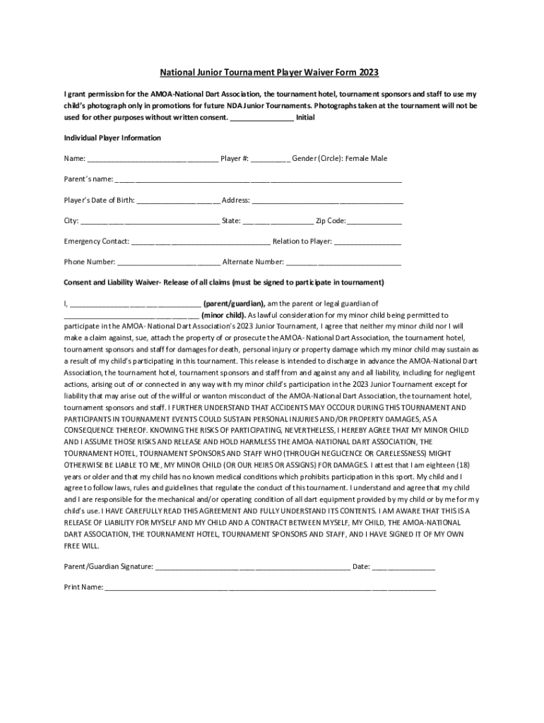 National Junior Tournament Player Waiver Form 2023 I grant permission for the Avocational Dart Association, the tournament hotel, tournament sponsors and staff to use my children photograph only in