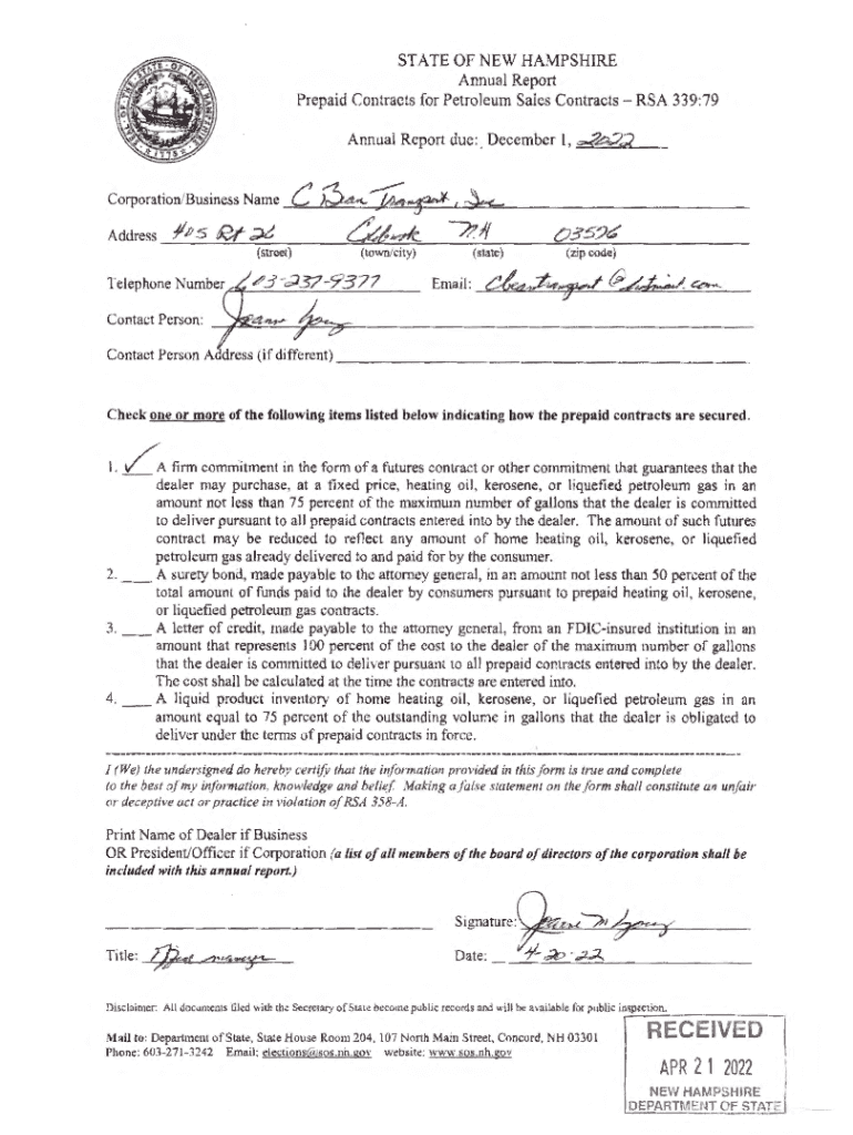 STATE OF NEW HAMPSHIRE Annual Report Prepaid Contracts for Petroleum Sales Contracts RSA 339:79 Annual Report due:. December 1, Corporation/Business Name Address/P s R, t;XL).... \', c:5Jdc(street)Telephone