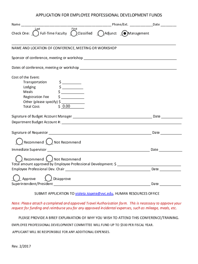 GUIDELINES FOR EMPLOYEES PROFESSIONAL DEVELOPMENT FUND REQUESTS NOTE: A Travel Authorization form must be completed and approved through District Travel Policies and a completed copy submitted with