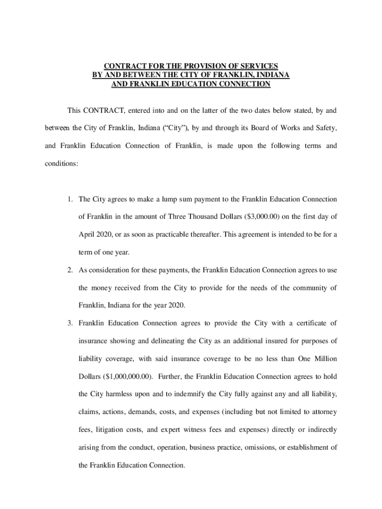 CONTRACT FOR THE PROVISION OF SERVICES BY AND BETWEEN THE CITY OF FRANKLIN, INDIANA AND FRANKLIN EDUCATION Connections CONTRACT, entered into and on the latter of the two dates below stated, by and