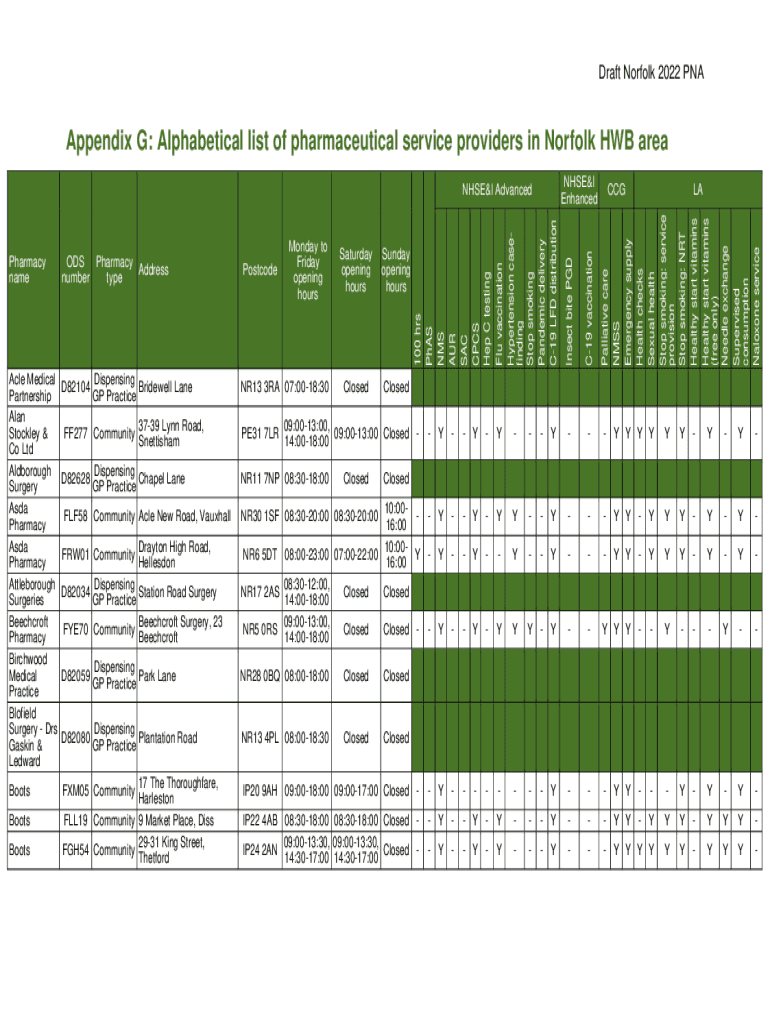 Draft Norfolk 2022 Appendix G: Alphabetical list of pharmaceutical service providers in Norfolk HUB area