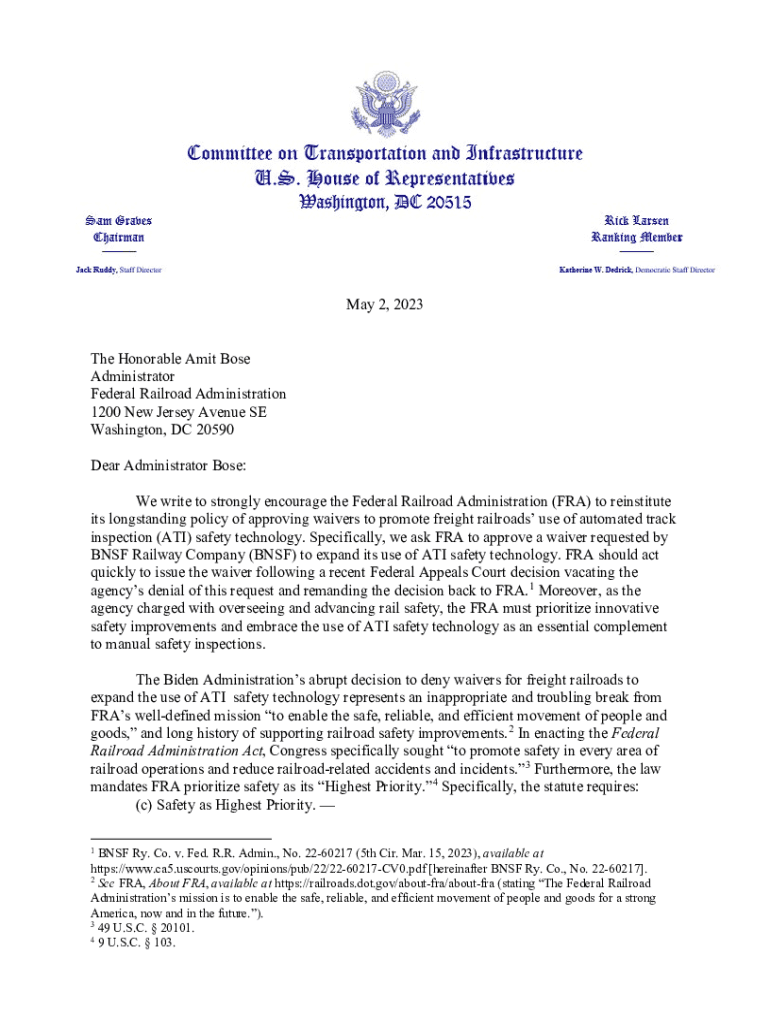 May 2, 2023, The Honorable Amit Bose Administrator Federal Railroad Administration 1200 New Jersey Avenue SE Washington, DC 20590 Dear Administrator Bose: We write to strongly encourage the Federal