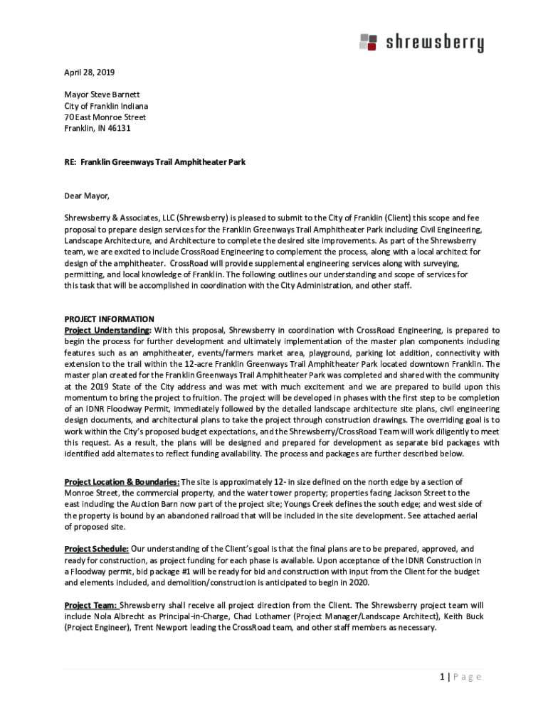 April 28, 2019, Mayor Steve Barnett City of Franklin Indiana 70 East Monroe Street Franklin, IN 46131RE: Franklin Green ways Trail Amphitheater Parker Mayor, Shrews berry & Associates, LLC (Shrews