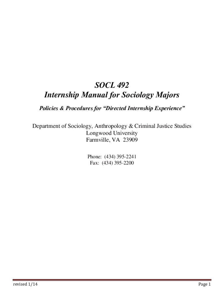 SOIL 492 Internship Manual for Sociology Majors Policies & Procedures for Directed Internship Experience Department of Sociology, Anthropology & Criminal Justice Studies Longwood University Farmville,