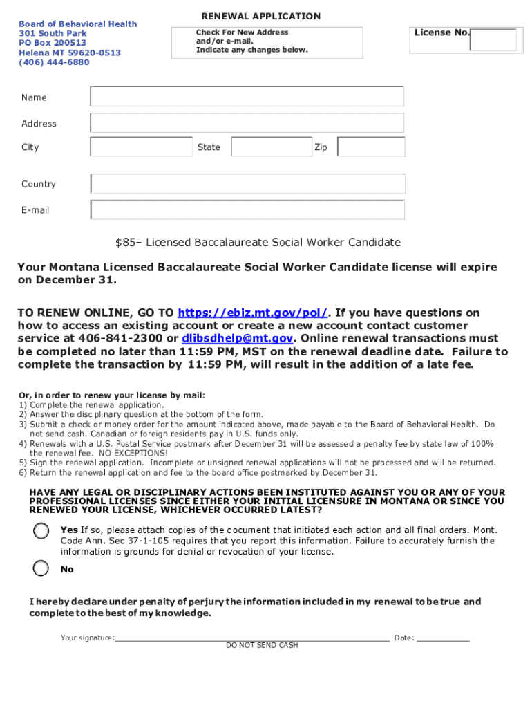 Board of Behavioral Health 301 South Park PO Box 200513 Helena MT 596200513 (406) 4446880RENEWAL APPLICATION License No. Check For New Address and/or email. Indicate any changes below. Name Address