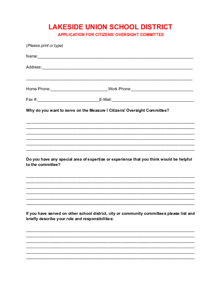 Lakeside Union School DistrictIndependent Citizens Oversight Committee Application The Board of Trustees of the Lakeside Union School District is seeking qualified, interested individuals to serve