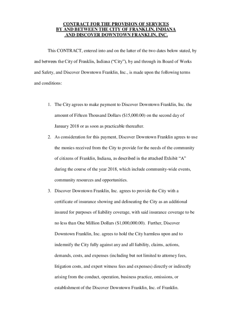 CONTRACT FOR THE PROVISION OF SERVICES BY AND BETWEEN THE CITY OF FRANKLIN, INDIANA AND DISCOVER DOWNTOWN FRANKLIN, INC. This CONTRACT, entered into and on the latter of the two dates below stated,