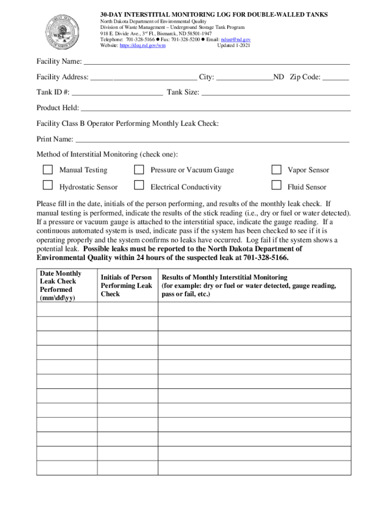 30DAY INTERSTITIAL MONITORING LOG FOR DOUBLEWALLED TANKS North Dakota Department of Environmental Quality Division of Waste Management Underground Storage Tank Program 918 E. Divide Ave., 3rd Fl.,
