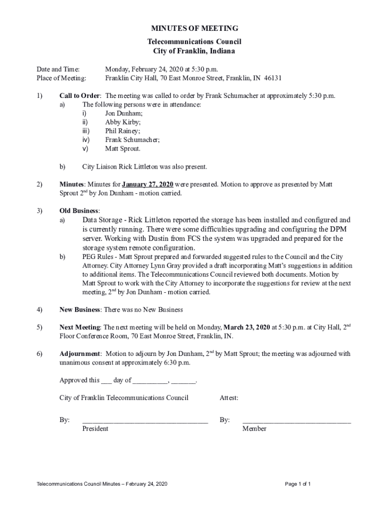MINUTES OF MEETING Telecommunications Council City of Franklin, Indiana Date and Time: Place of Meeting: 1)Monday, February 24, 2020, at 5:30 p.m. Franklin City Hall, 70 East Monroe Street, Franklin,