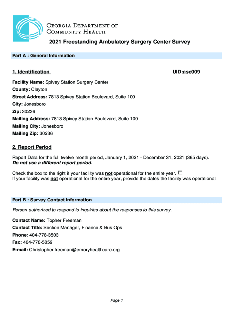2021 Freestanding Ambulatory Surgery Center Survey Part A : General Information1. Identification:asc009Facility Name: Shiva Station Surgery Center County: Clayton Street Address: 7813 Shiva Station
