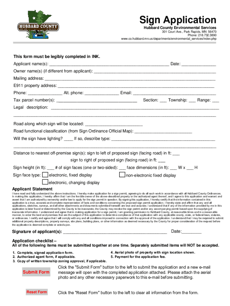 Sign Application Hubbard County Environmental Services301 Court Ave., Park Rapids, MN 56470 Phone: 218.732.3890 www.co.hubbard.mn.us/departments/environmental_services/index.phpFAQs: What requires