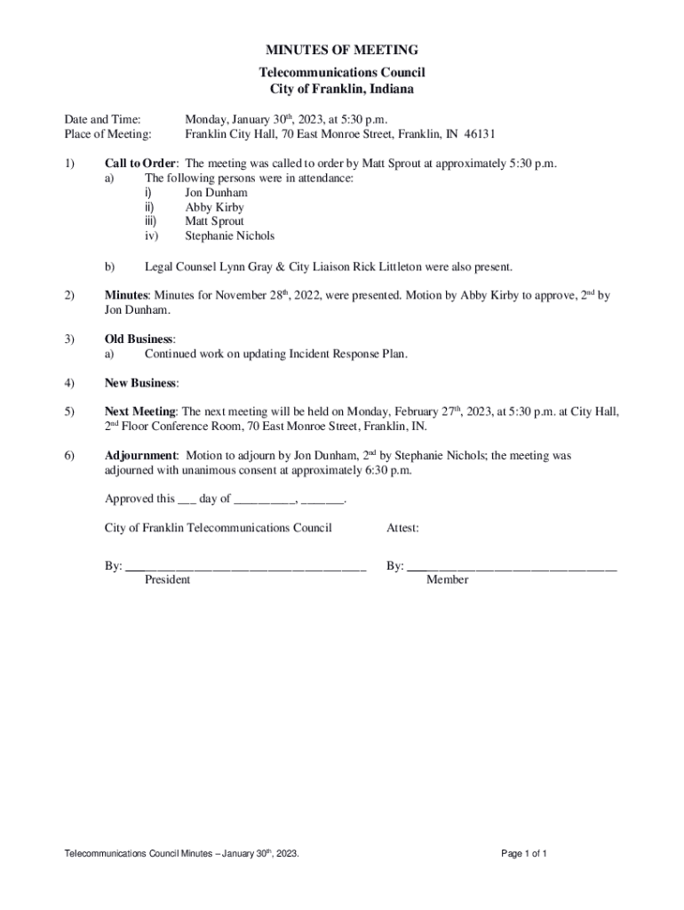 MINUTES OF MEETING Telecommunications Council City of Franklin, Indiana Date and Time: Place of Meeting: 1)Monday, January 30th, 2023, at 5:30 p.m. Franklin City Hall, 70 East Monroe Street, Franklin,