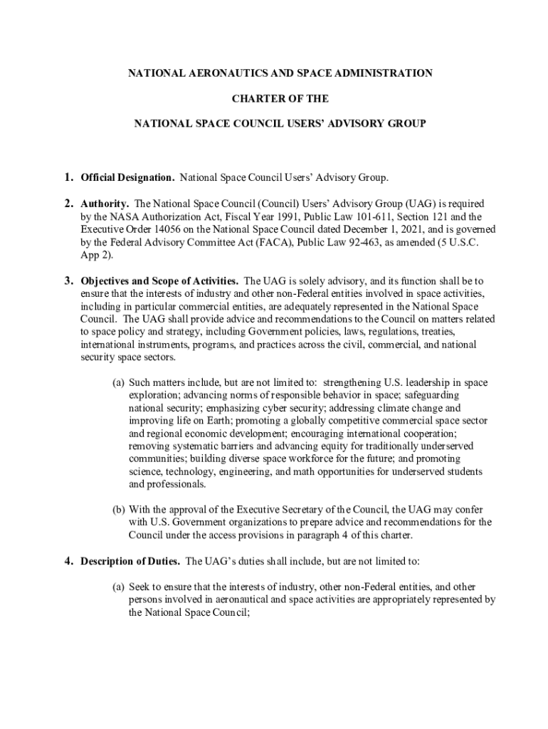 NATIONAL AERONAUTICS AND SPACE ADMINISTRATION CHARTER OF THE NATIONAL SPACE COUNCIL USERS ADVISORY GROUP1. Official Designation. National Space Council Users Advisory Group. 2. Authority. The National