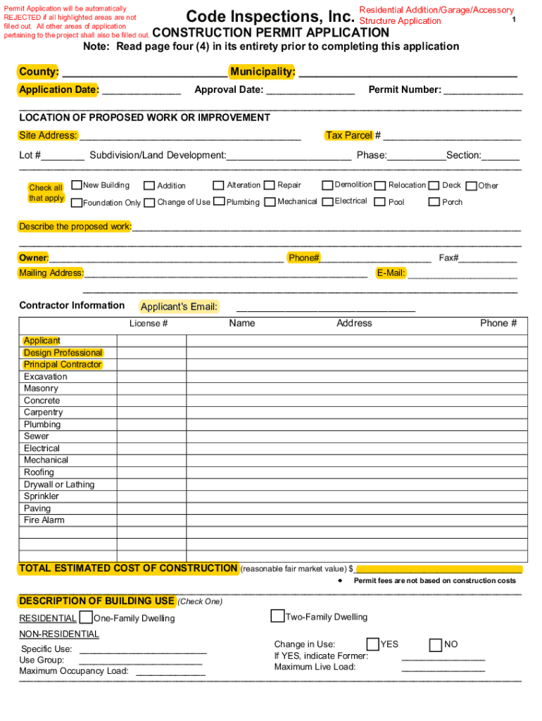 Permit Application will be automatically REJECTED if all highlighted areas are not filled out. All other areas of application pertaining to the project shall also be filled out. Residential Addition/Garage/AccessoryCode