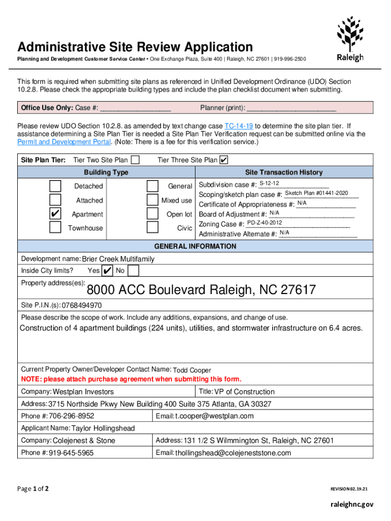 Administrative Site Review Application Planning and Development Customer Service Center One Exchange Plaza, Suite 400 | Raleigh, NC 27601 | 9199962500This form is required when submitting site plans