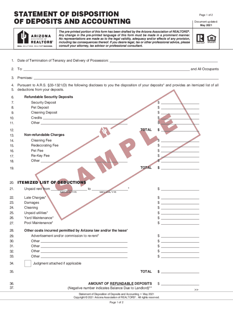STATEMENT OF DISPOSITION OF DEPOSITS AND ACCOUNTING Page 1 of 2 Document updated: May 20211. Date of Termination of Tenancy and Delivery of Possession: 2. To:and All Occupants3. Premises: 4. Pursuant