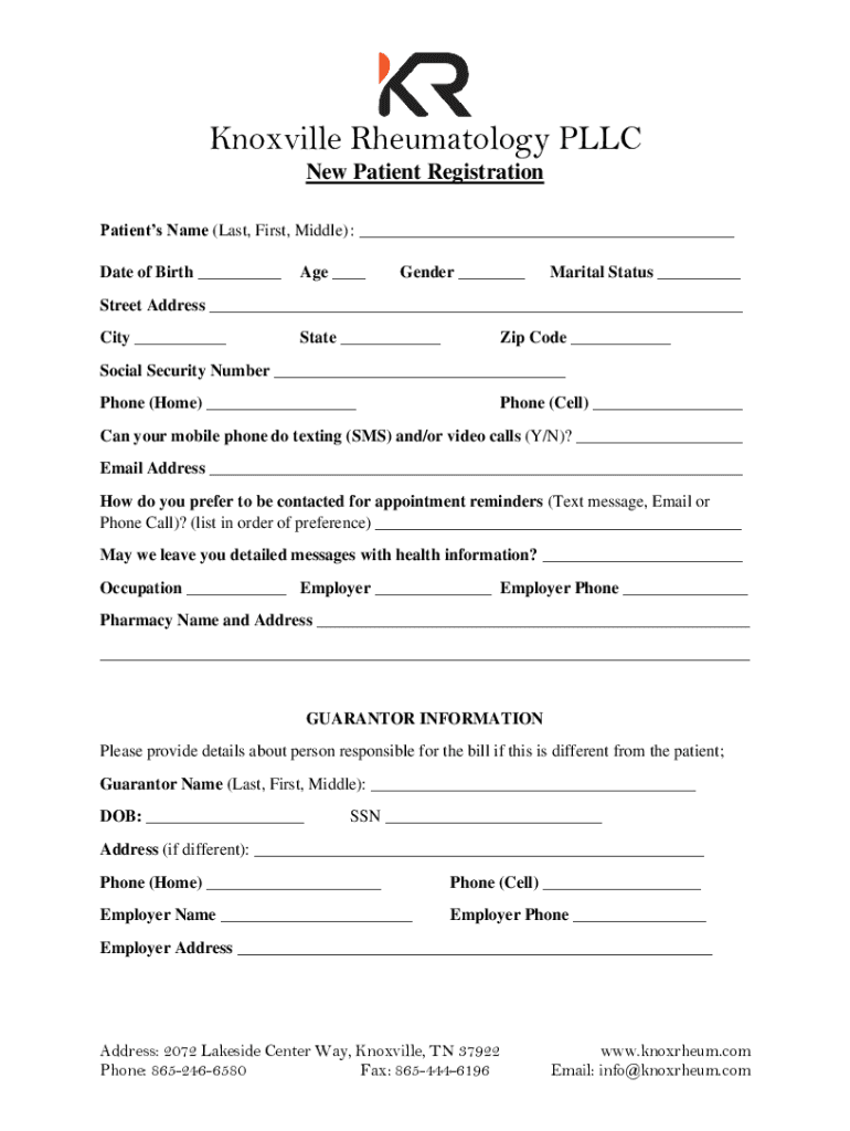 Knoxville Rheumatology LLC New Patient Registration Patients Name (Last, First, Middle) : ___ Date of Birth ___Age ___Gender ___Marital Status ___Street Address ___ City ___State ___Zip Code ___Social