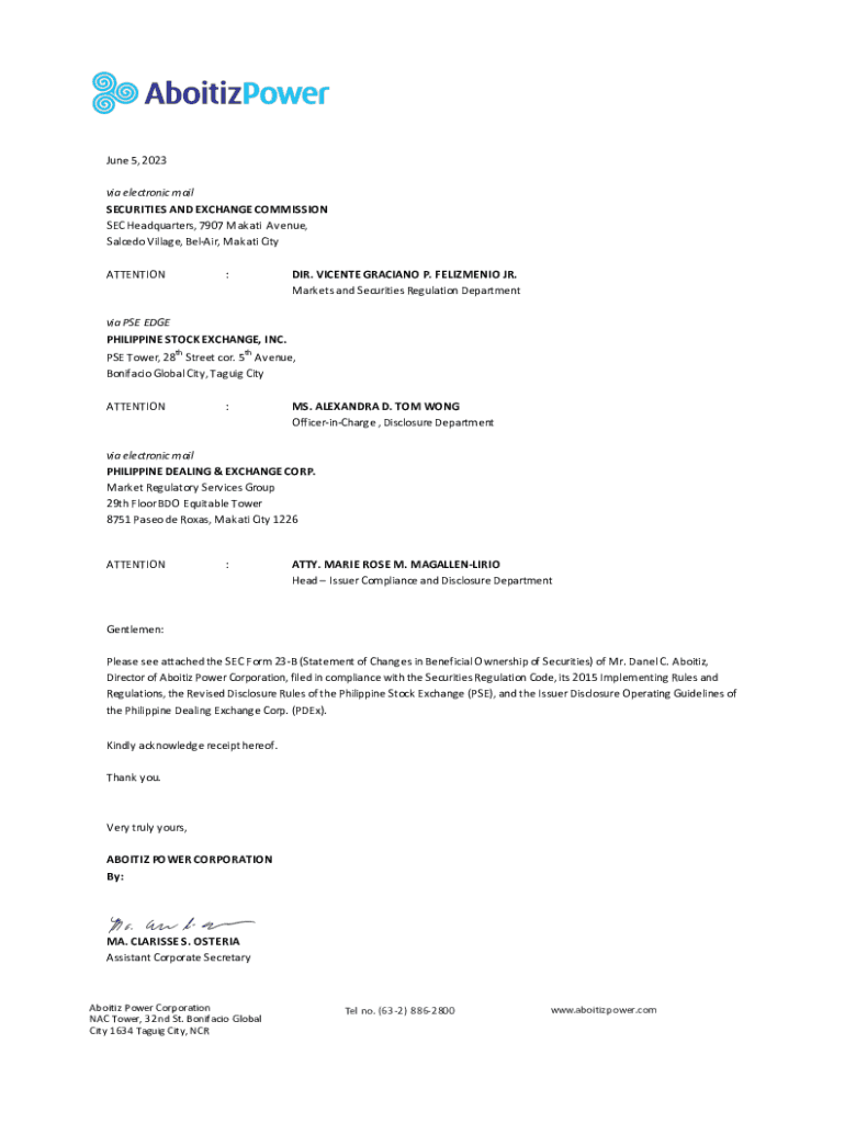 June 5, 2023, via electronic mail SECURITIES AND EXCHANGE COMMISSION SEC Headquarters, 7907 Marathi Avenue, Salted Village, Blair, Marathi City ATTENTION:DIR. VICENTE GRACIANO P. FELIZMENIO JR. Markets