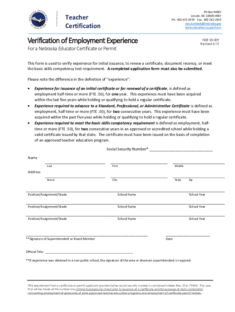 PO Box 94987 Lincoln, NE 685094987 pH: 4024710739 Fax: 4027422359 nde.tcertweb@nebraska.gov www.education.ne.gov/tcertTeacher CertificationVerification of Employment Experienced 20009 Revised 615For